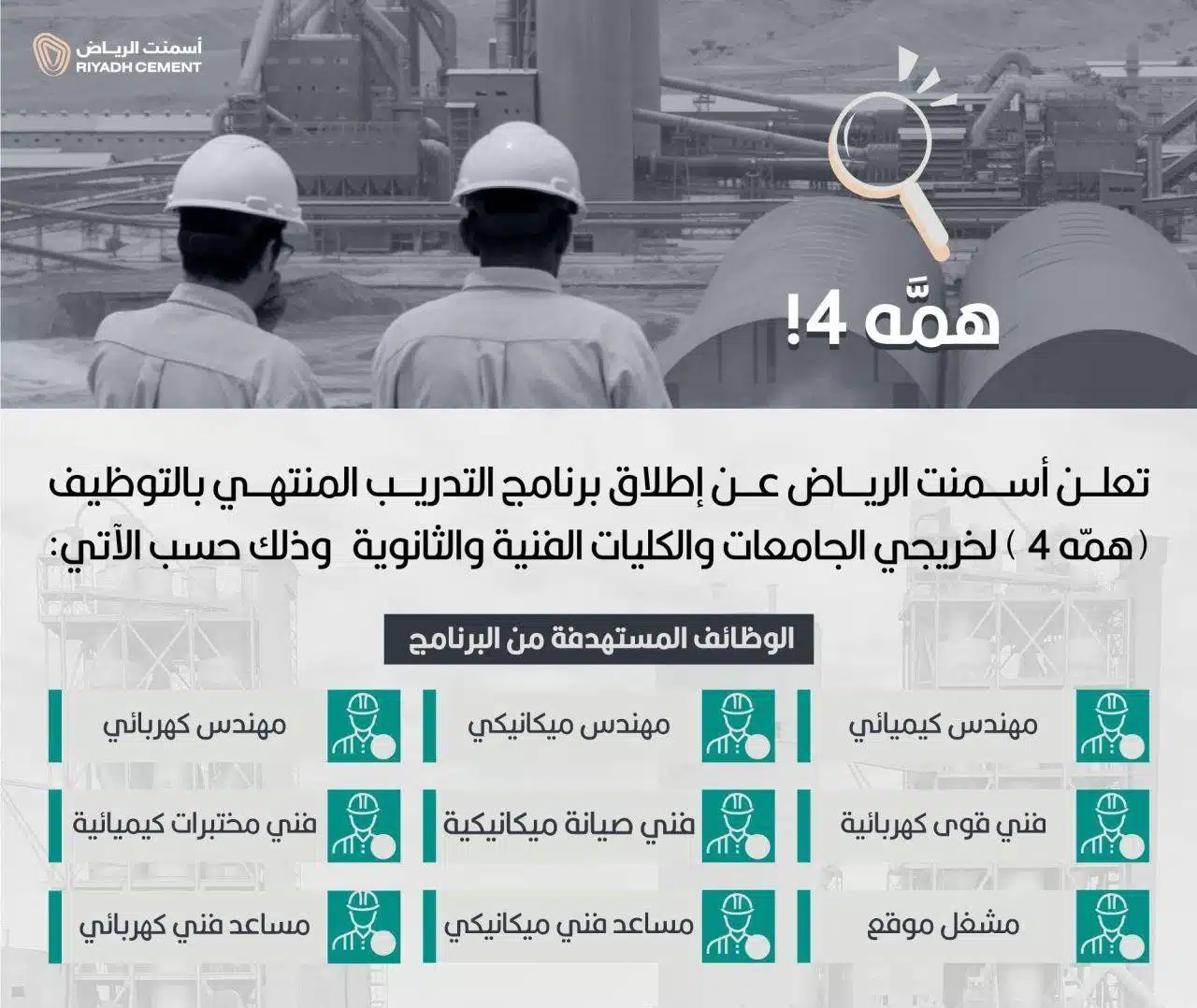 تقدم شركة أسمنت الرياض برنامج تدريب منتهي بالتوظيف لخريجي الثانوية، الدبلوم، والجامعات (للمواطنين والمقيمين) في مجموعة واسعة من التخصصات. يهدف البرنامج إلى تأهيل المتدربين للحصول على فرص عمل متميزة برواتب عالية ومزايا تنافسية.